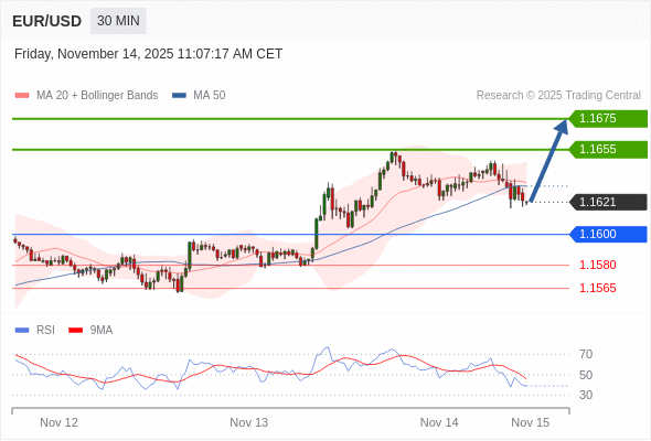 在 1.1600 之上,看涨,目标价位为 1.1655 ,然后为 1.1675 。
