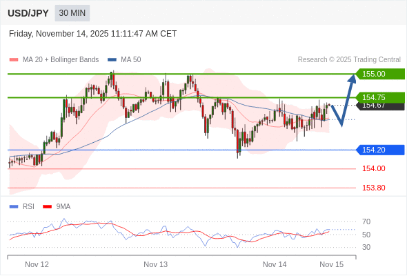 在 154.20 之上,看涨,目标价位为 154.75 ,然后为 155.00 。
